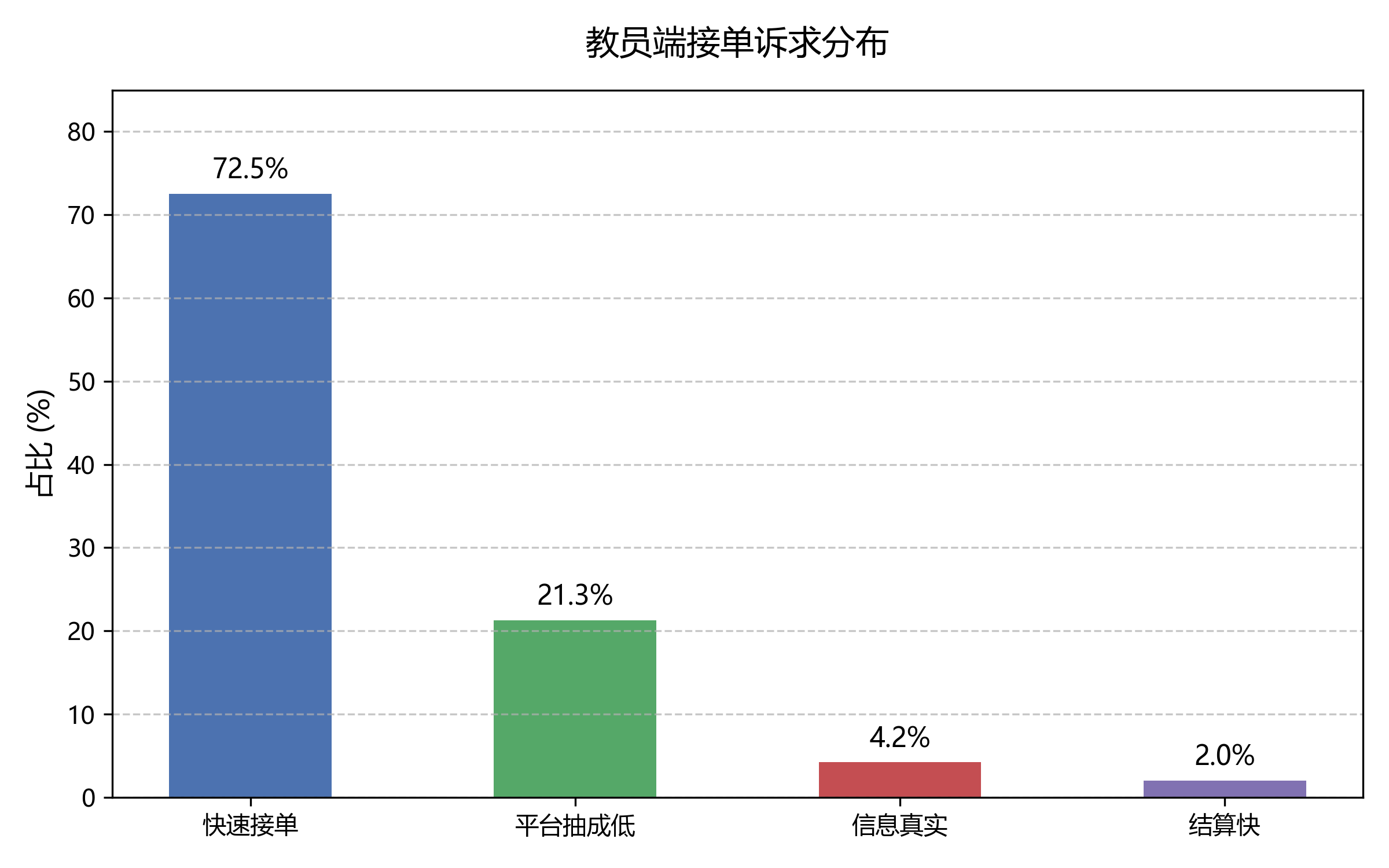 教员端:超过 70% 的人最在意“能不能快速接到单”,对平台抽成的敏感度反而排第二。