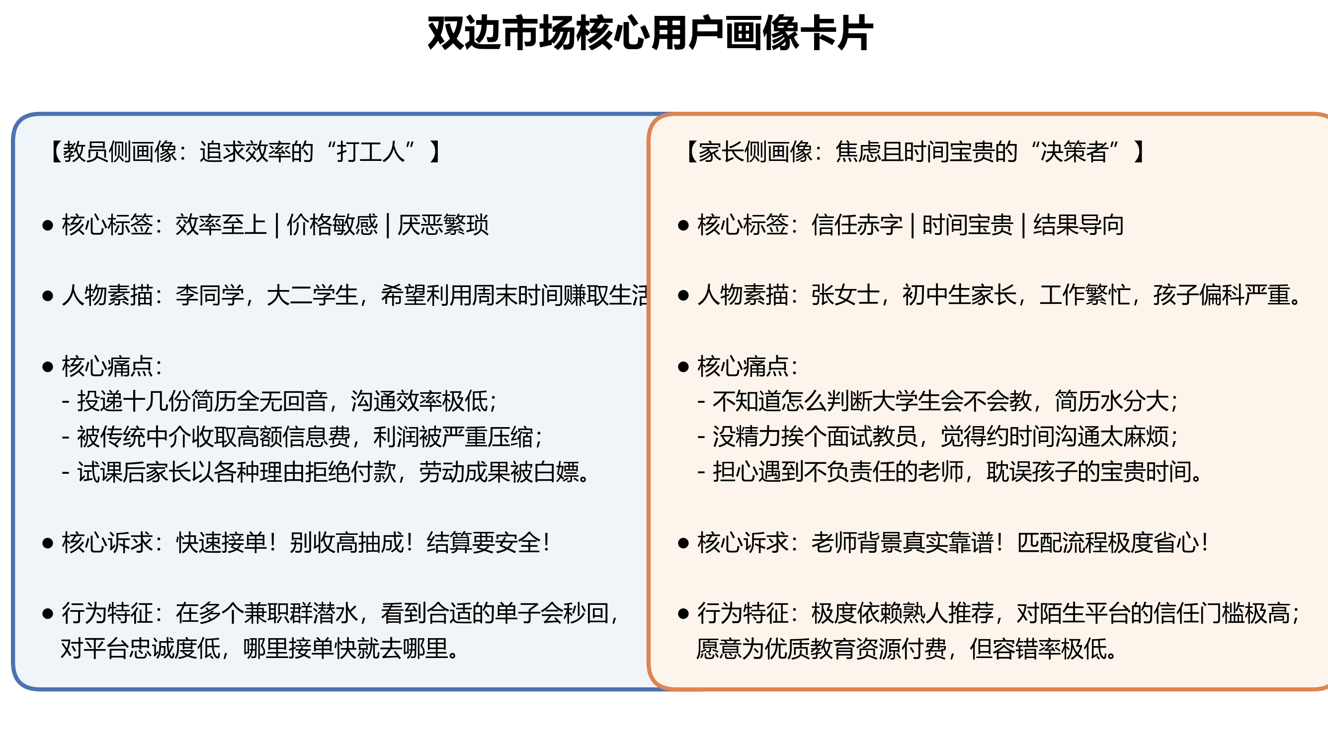 拿到数据之后,我用 Agent 辅助跑了一轮竞品分析,把市面上几个主流家教平台拆了一遍,提炼了它们在审核、匹配、抽佣三个维度的做法,然后输出了两份用户画像卡片。