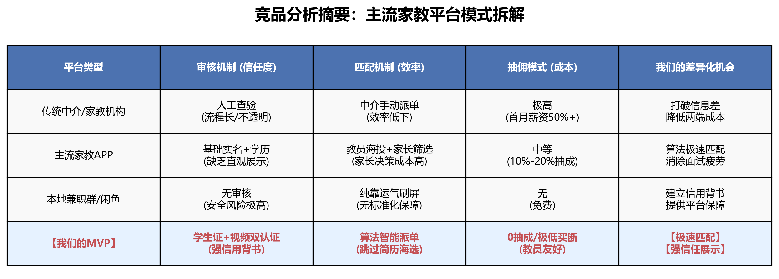 做完这一步,产品定位就清楚了:做一个轻量的、以“快速匹配”为核心、优先解决信任和效率问题的工具,而不是大又全的平台。