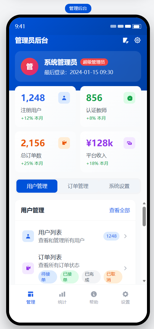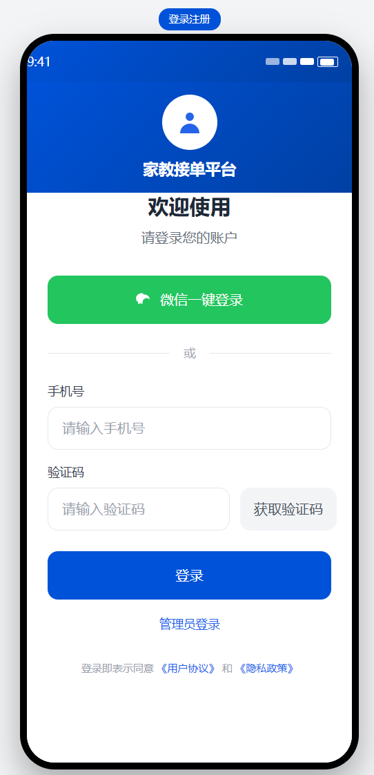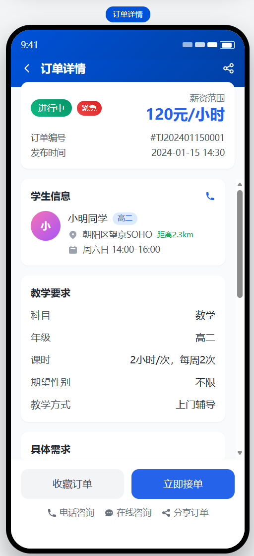 2. 家长发单 → 系统推送给符合条件的教员 → 教员接单