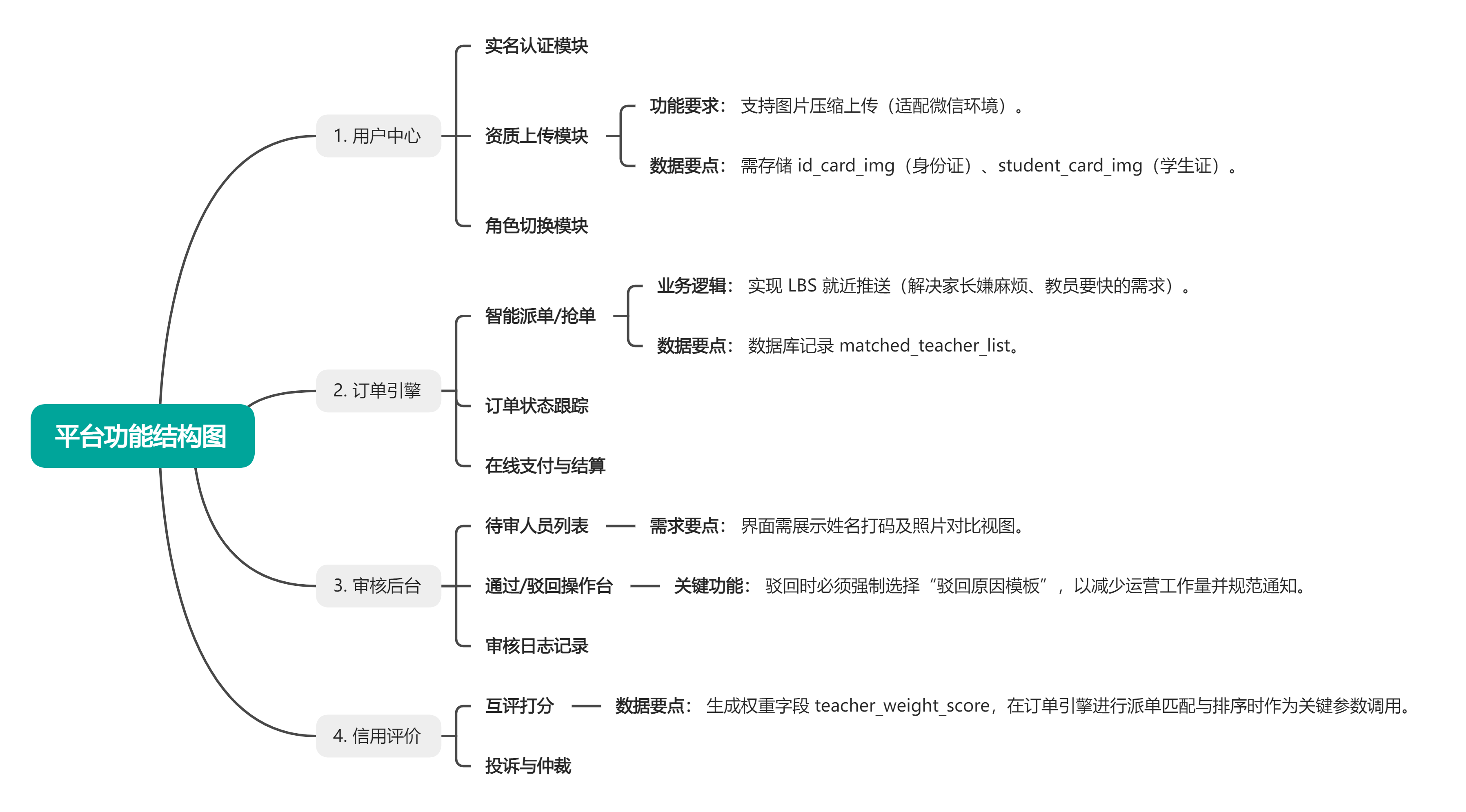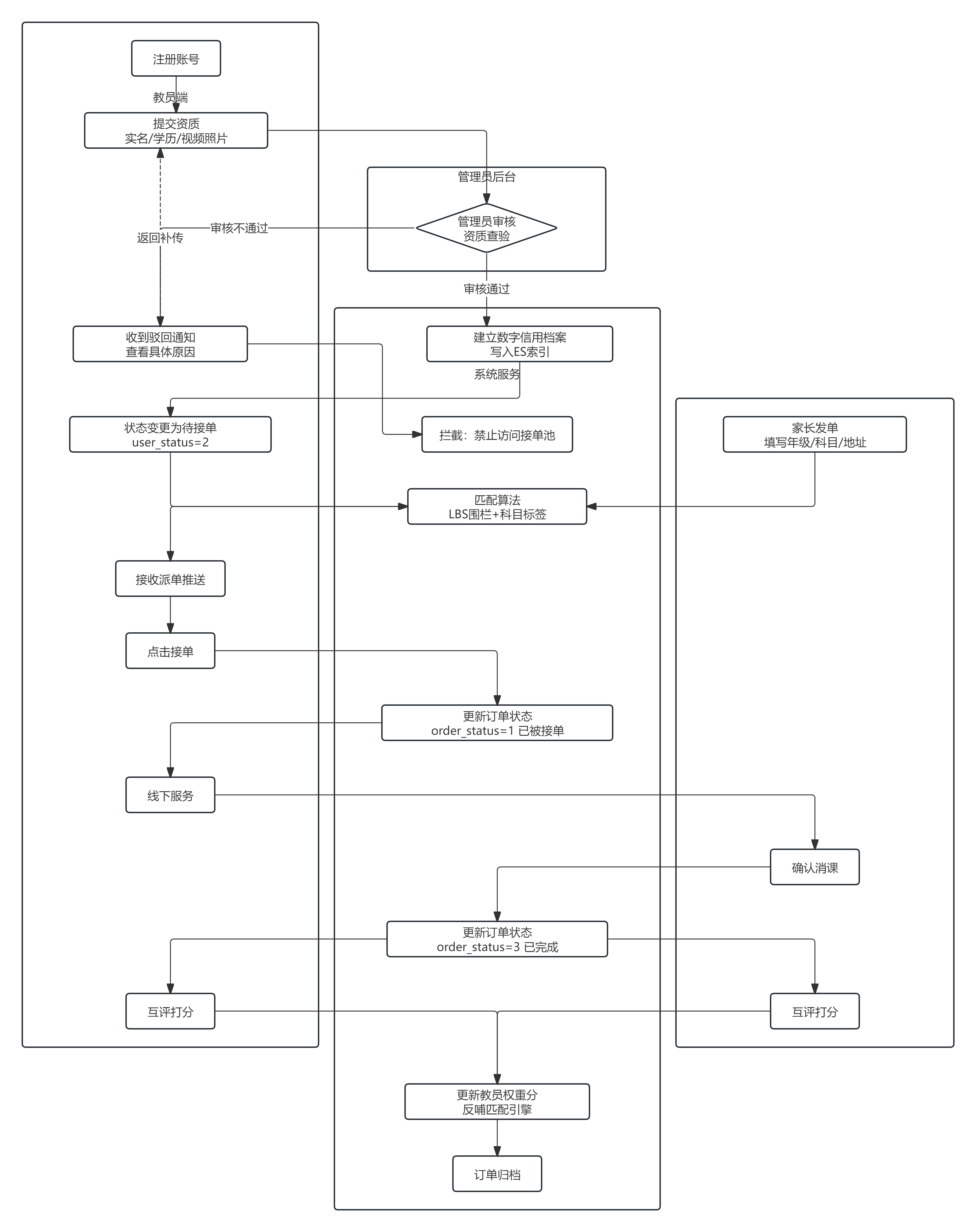 整张图里我最花时间琢磨的是审核节点。家教场景下,信任是前置条件,所以审核不能做成事后补救的环节,必须卡在教员进入接单池之前。下面这张图里用红色标出的就是这条关键路径。