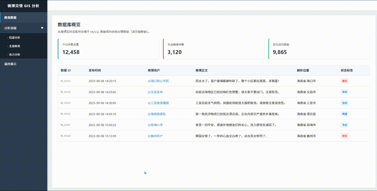 一句话总结:基于微博数据的灾后舆情分析系统,旨在利用 NLP 技术从海量非结构化文本中提取关键求救信息并进行空间可视化,并探讨灾后民众的关注焦点与情感状态在时间维度上具有怎样的演变规律。